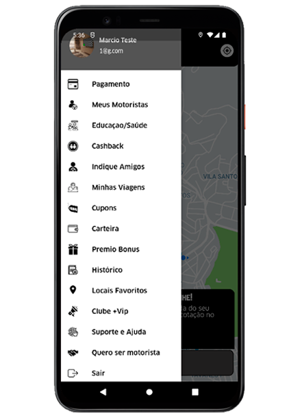 Meus motorista onde pode ser adicionado favoritos . Educação Saúde, para profissionais que trabalha na area pode se cadastrar e ganha desconto. Cashback onde pode acompanhar seus indicados, atingindo meta transfere valor direto para carteira ou solicita deposito em conta. Indique amigos, motra o código id de incicação e compartilha. Minhas viagens, mostra detalhes e histórico de todas até o momento. Cupons, se existir na franquia pode acionar desconto oferecido pela plataforma. Carteira, onde pode verificar seu saldo. Prêmio bonus, onde acompanha seus cancelamentos que te faz perder pontos se existir algum, no caso de cancelamento do motorista usúario ganha pontos. Histórico, onde acompanha valores gastos. Locais favoritos, onde adiciona endereço de embarque e desembarque para uma solicitação mais rápida! Clube Mais, onde existe propaganda de parceiros do aplicativo com link que direciona para o anunciante.